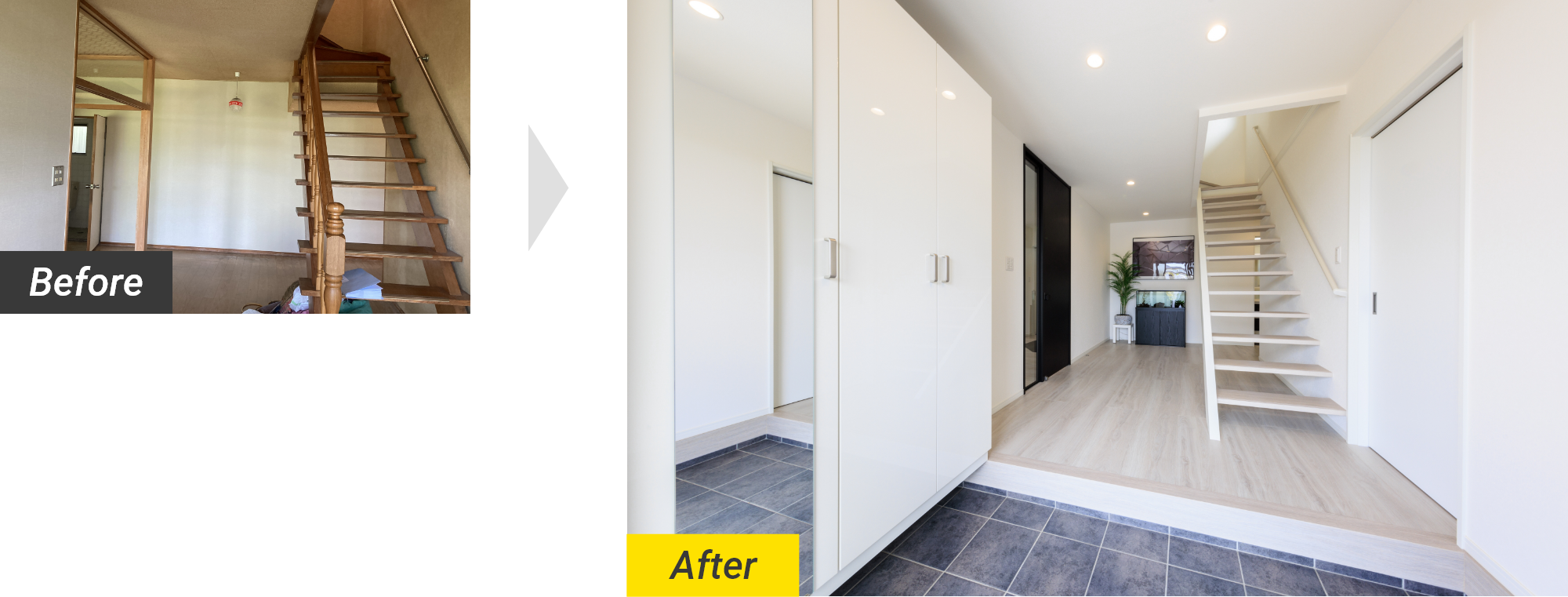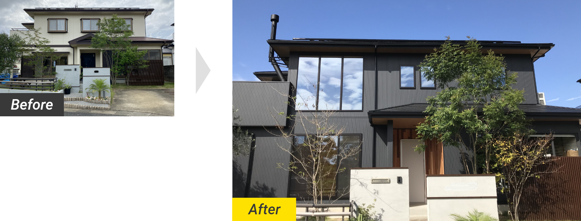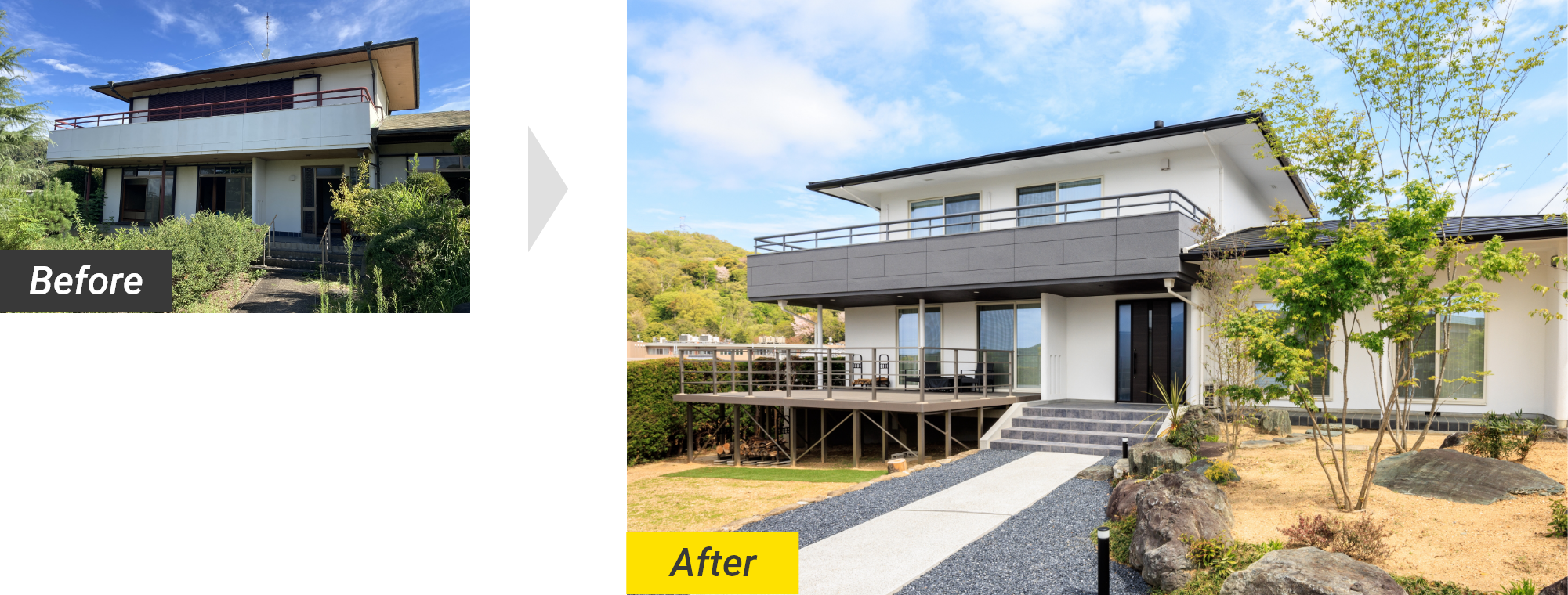 薪ストーブ、車のガレージがある暮らしを夢見て、眺望が素晴らしく、広い土地に建つ中古住宅を購入したお施主様。趣のある和風の住まいでしたが、ご家族のライフスタイルに合わないため、まるごとリフォームでモダンな住まいへ再生することに。