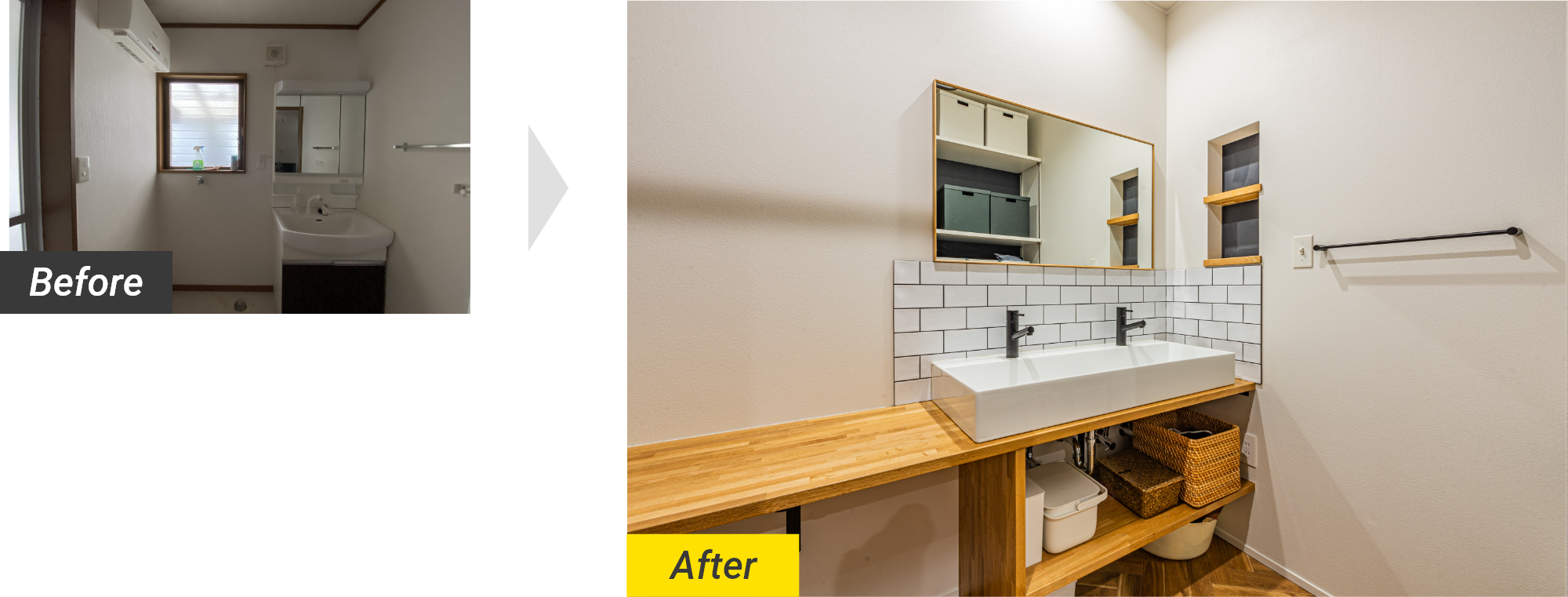 トイレを移動し洗面室を広げ、洗面化粧台は家事カウンターと一体型に。家事カウンターでは洗濯物をたたんだり、アイロンがけをしたりできます。