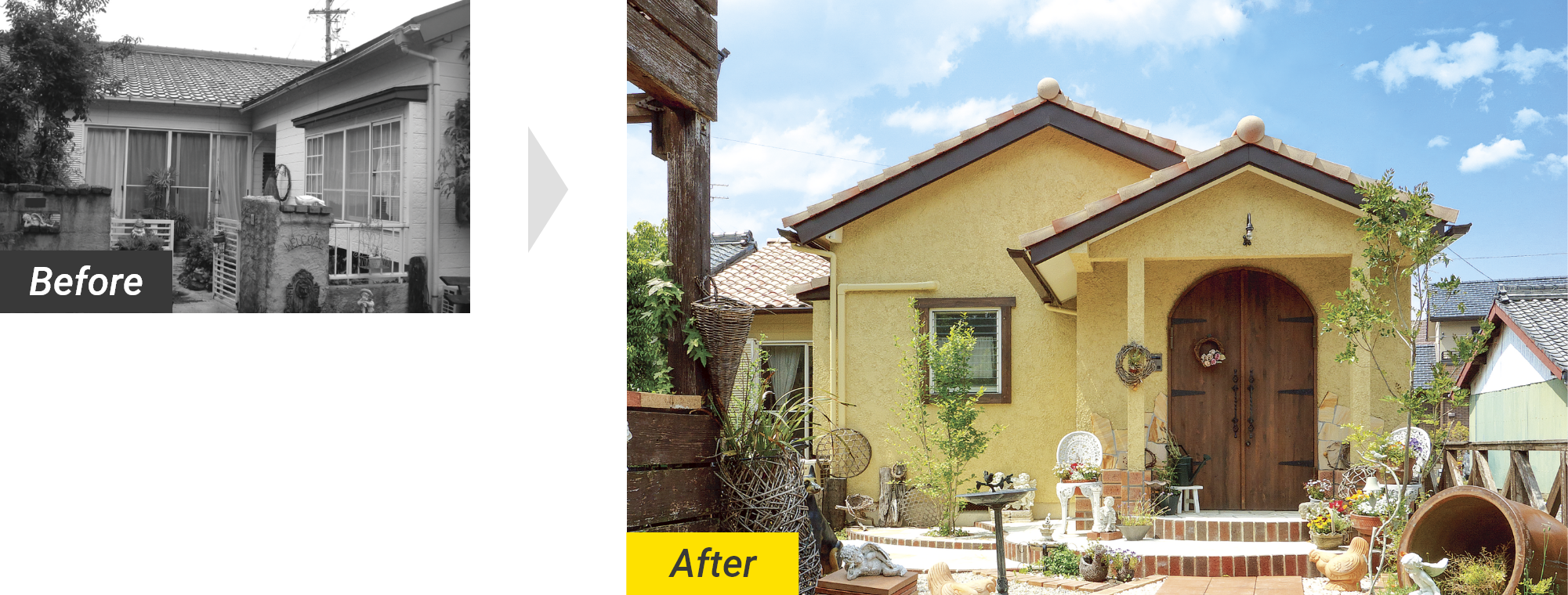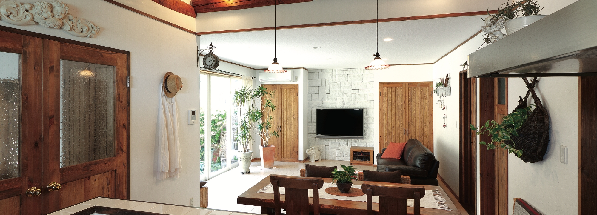 築31年のご自宅を、南欧風の邸宅に改築されたお施主様。奥様の夢は、将来、ご自宅で雑貨ショップを開くこと。アンティーク調の味わいを活かした外観や、玄関から小径のように続く屋内のアプローチ、太い梁を現したナチュラル感あふれるLDKは、奥様がずっと心に温めていた、憧れのイメージそのもの。水廻りの位置も変更し家事もしやすくなりました。