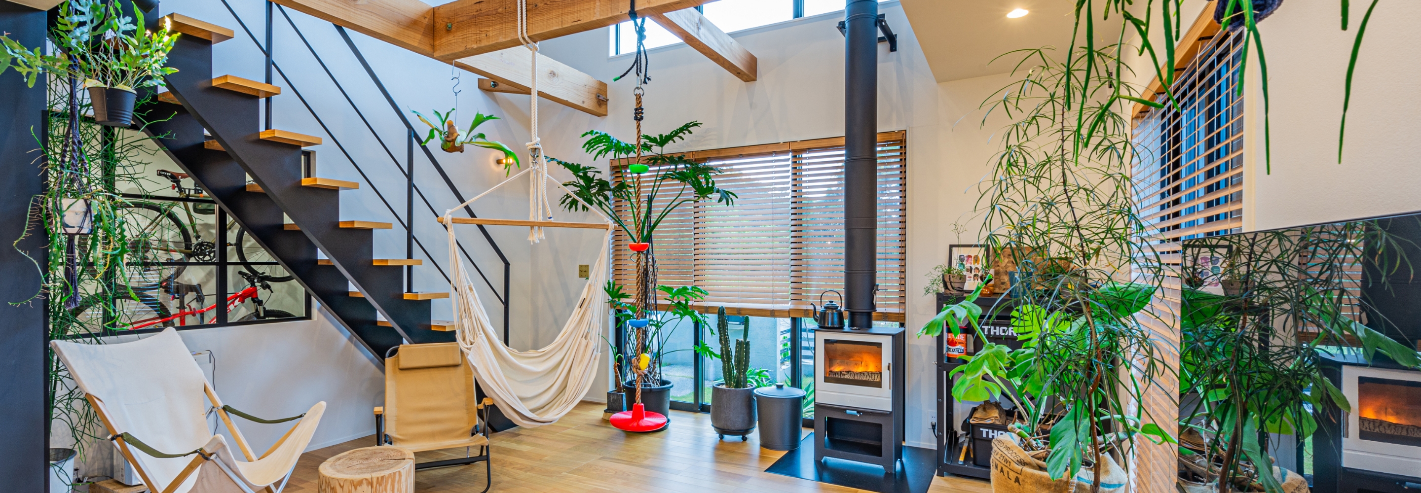 LDKは明るく開放的な吹抜けとし、自然との調和をイメージして天井面には木を張るとともに、薪ストーブを設置。吹抜けとなり現れた梁が子供達が遊ぶハンモック掛けや猫のキャットウォークとなりました。