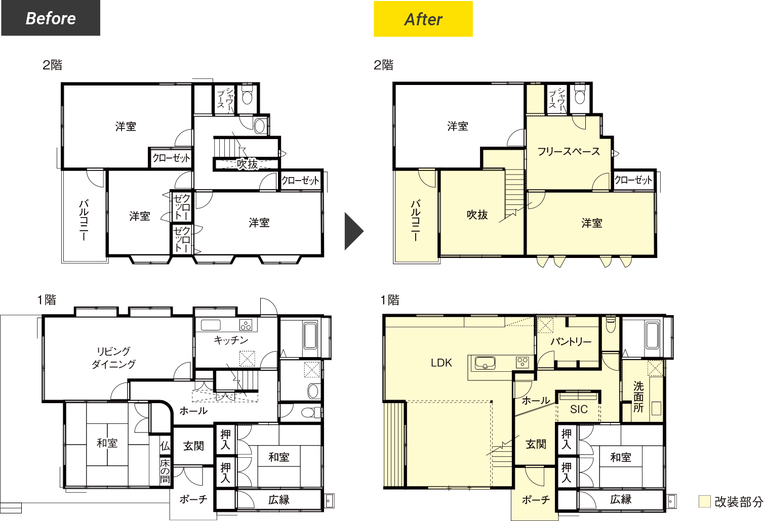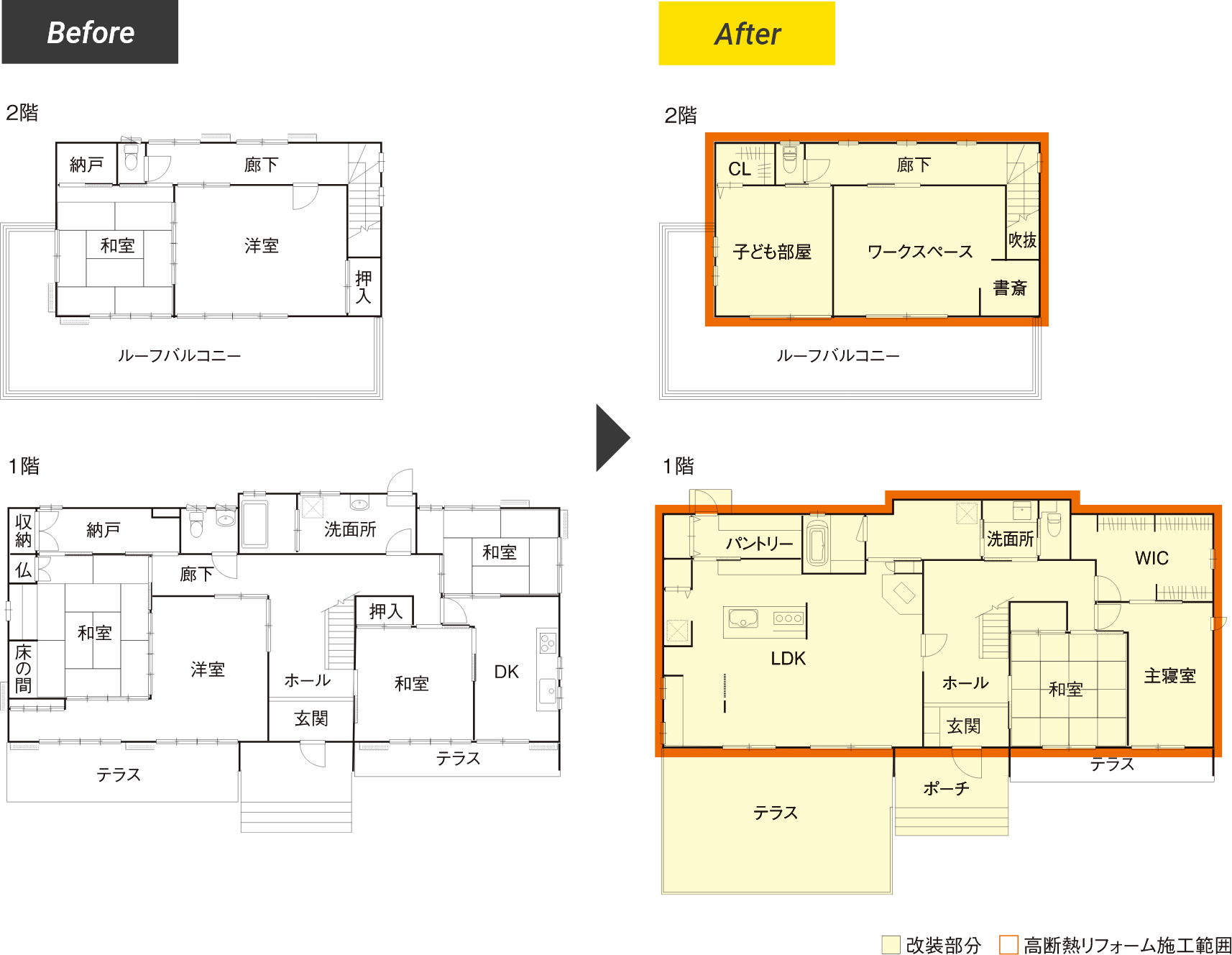 周囲の豊かな自然にあこがれて購入された中古住宅を、断熱・耐震性能向上とともに家事・育児の負担軽減、家族みんなが楽しく成長できる家にしたいと考えリフォームすることに。LDKを中心に断熱窓への交換や断熱材充填、耐震補強、防蟻処理等の劣化対策を施しました。
