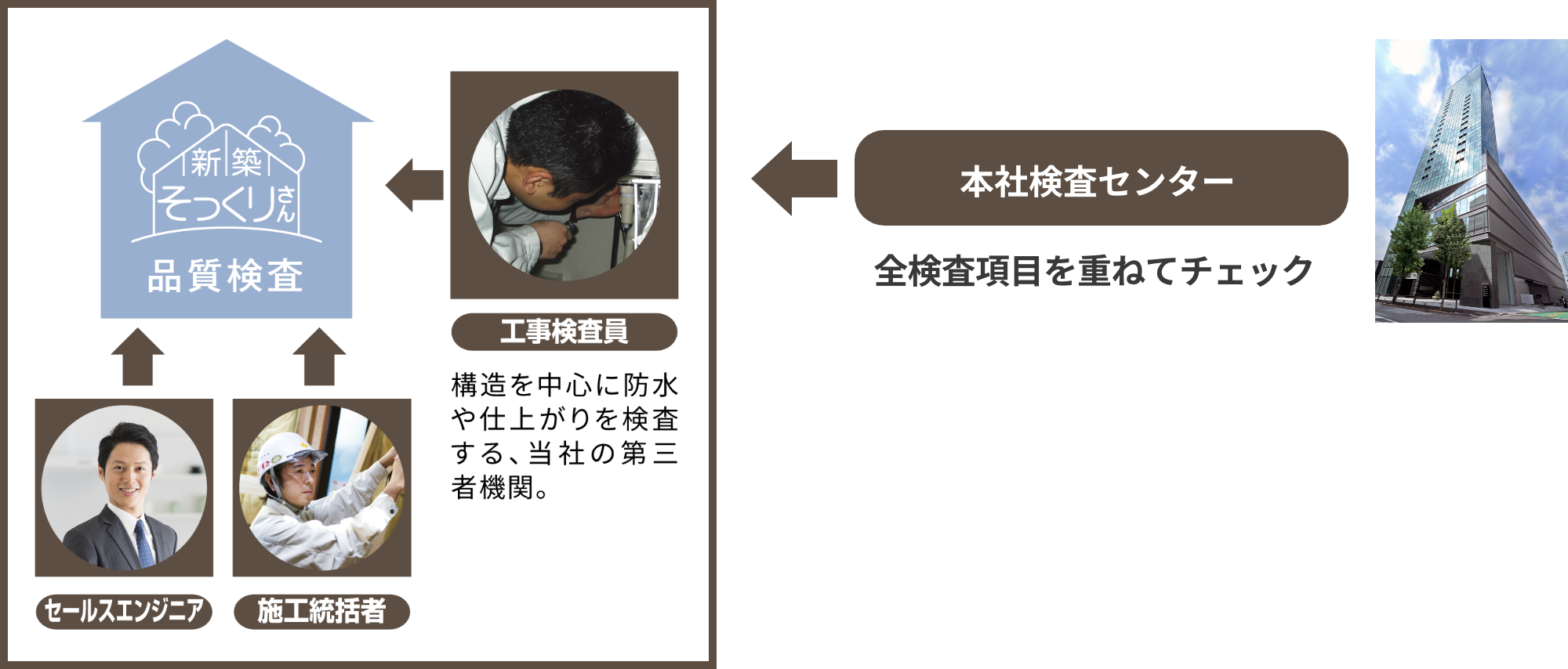 住宅完成後も長期間、高い品質を保持するために「新築そっくりさん」は、検査体制にも重点を置いています。セールスエンジニアと施工統括者が日々の工事のチェックを行い、工事検査員が検査。その検査結果の全数を本社検査センターにて重ねてチェックしています。