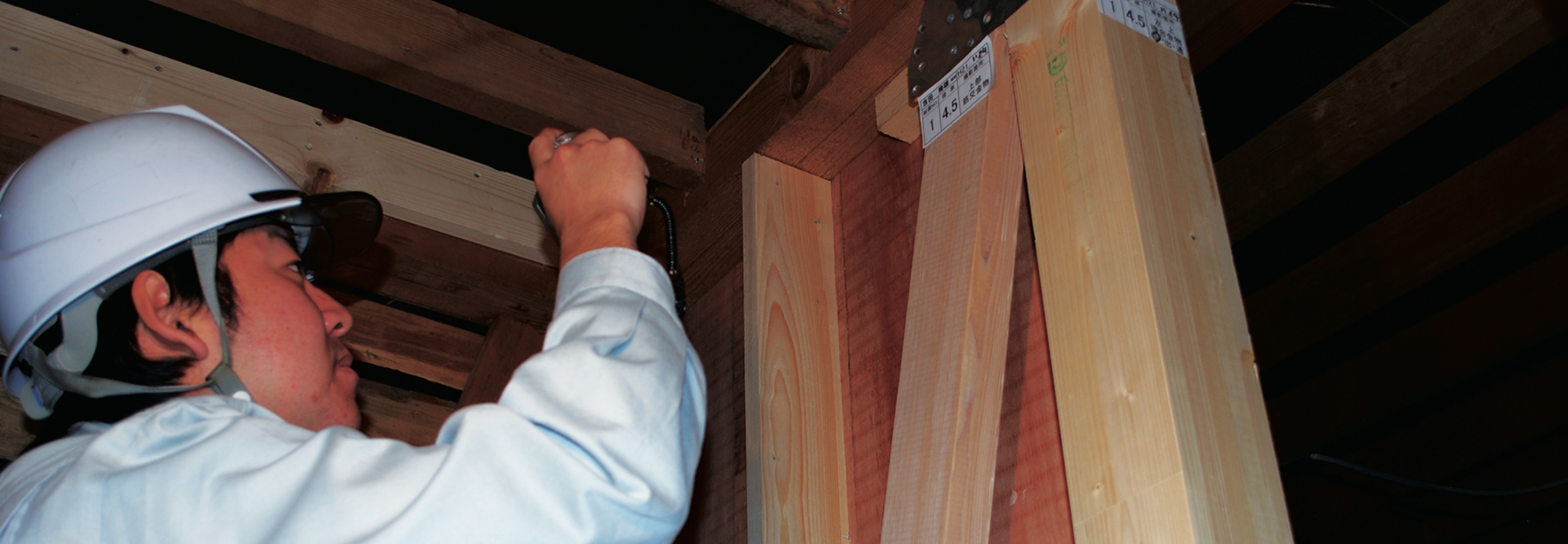 揺れに強い耐力壁をつくる検査です。筋交いの幅や釘打ちの間隔、金物補強の的確さなど細部にわたり全数点検します。