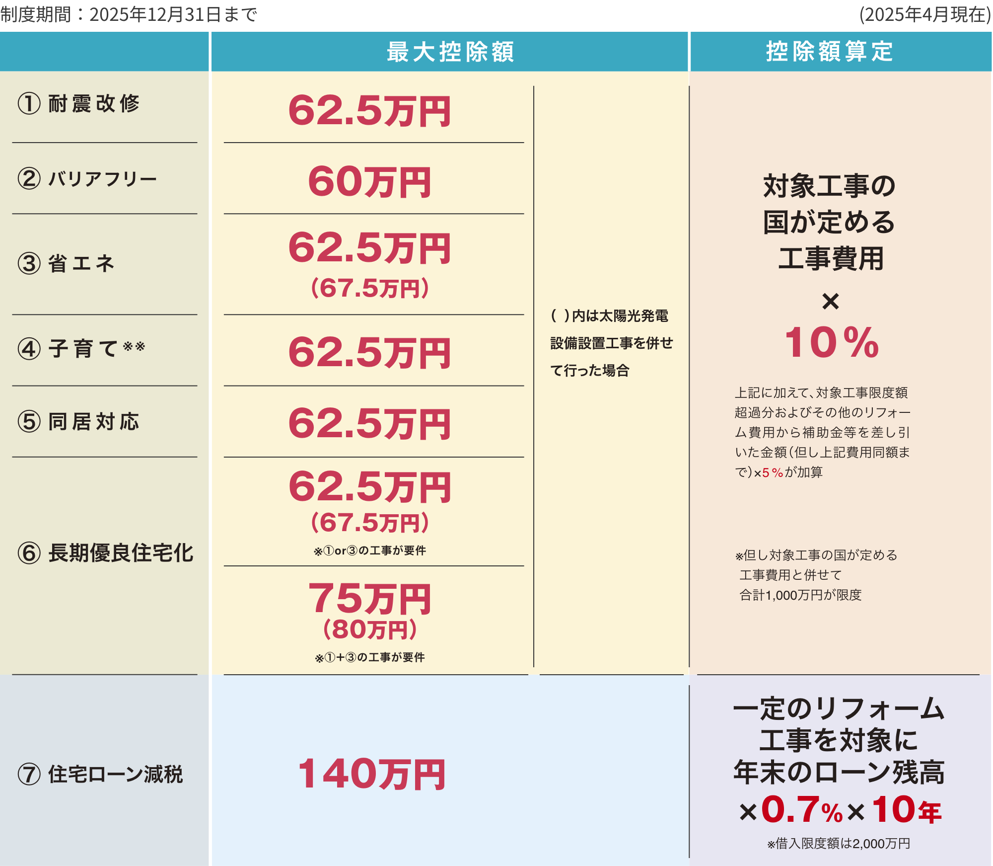 新築そっくりさんで行う工事内容に応じ、次のようなさまざまな減税制度(税制優遇措置)を利用することで、