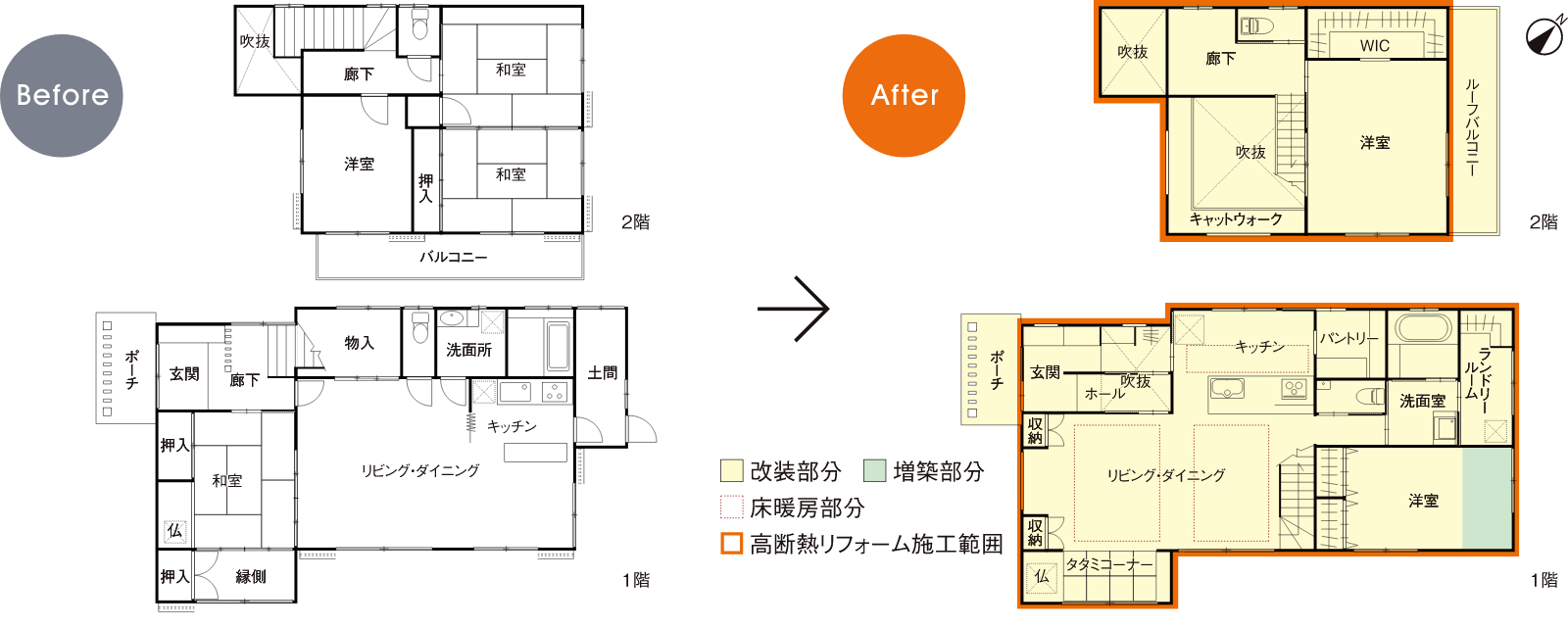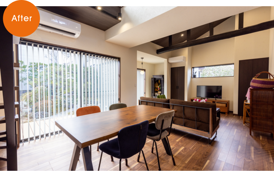 天井が低く圧迫感を感じていたことから、吹き抜けを施し窓を多く配した明るく開放的なLDKに。冬場の寒さを改善したいとのご要望には「高断熱リフォームプラン」を採用。壁・床・天井に断熱材を充填し、サッシは気密断熱性能の高い製品に一新。