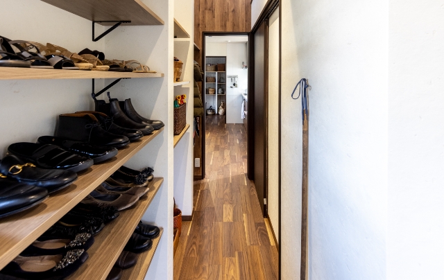 吹き抜けの玄関収納はいつも明るく。コートなどを掛けられるお出かけクローゼットとキッチンまで直接行ける動線がとても便利です。
