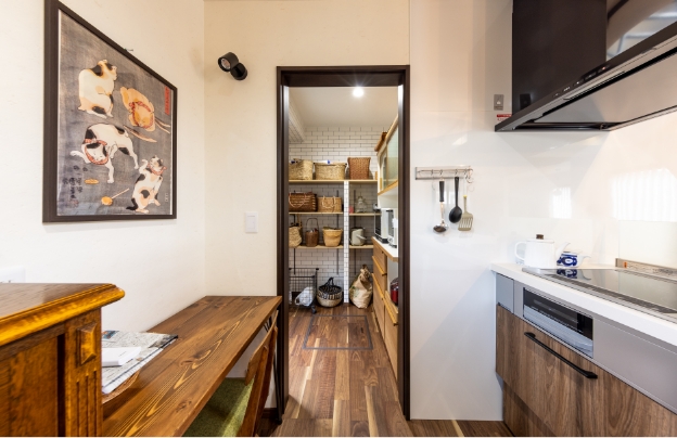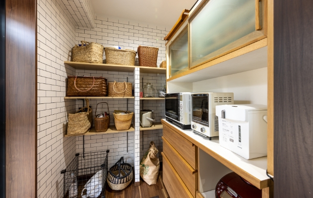 食材などのストックもひと目でわかり、床下収納も設けたパントリー。既存の食器棚も活用し食器や調理家電を収納しています。