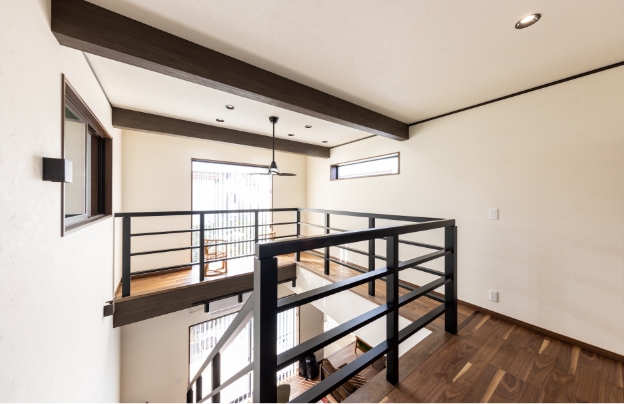 2階の吹き抜け部分にはキャットウォークを造作し、読書やティータイムを楽しんだり。メンテナンスや窓掃除の時にも役立つ。