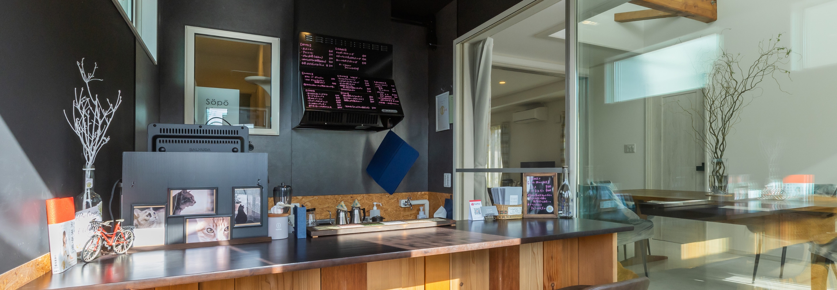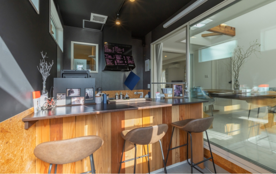 前面道路からアクセスしやすい場所にカフェをオープン。カウンター下部には杉板を施し、腰壁は汚れても気にならないパーティクルボードに。