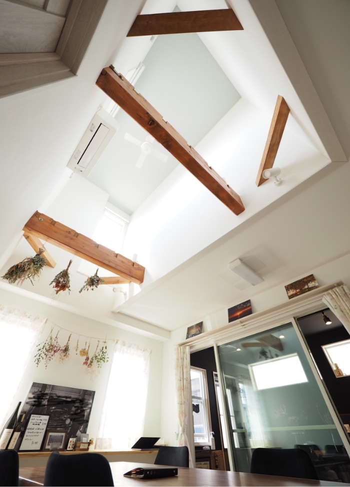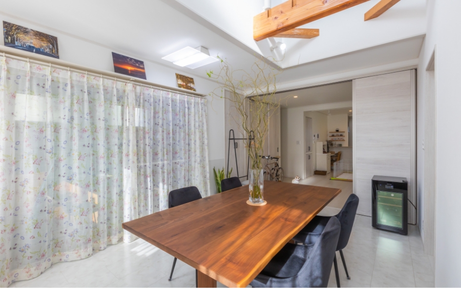 お客様のご要望に寄り添いながら、お客様にとって何が一番最善なのかを考えたうえでプラン提案を行います。今回は「明るい空間で開放的に暮らしたい」というご要望から、2階の床一部を撤去して吹き抜けを提案しました。お住まいになられ、断熱性や遮音性の向上を実感して頂き、光熱費も軽減されたとのことで、省エネルギー住宅に生まれ変わりました。