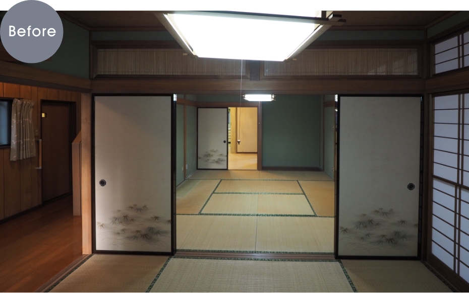 昭和の細かく区切られた間取りで、広縁があり光が部屋の奥まで届かないことがお悩みだったことから、明るい南西側の3つの和室と納戸、広縁をひとつにして、大空間のLDK+多目的スペースに。上部には吹き抜けを施し、より一層の開放感を演出しています。