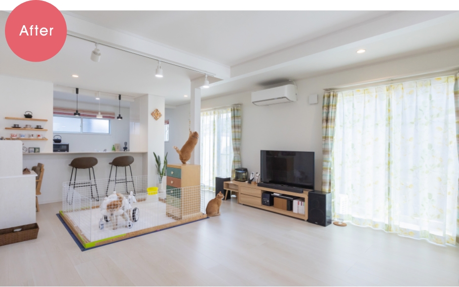 白で統一して明るく開放的なLDK。ペット対応の高耐久の壁紙を採用。