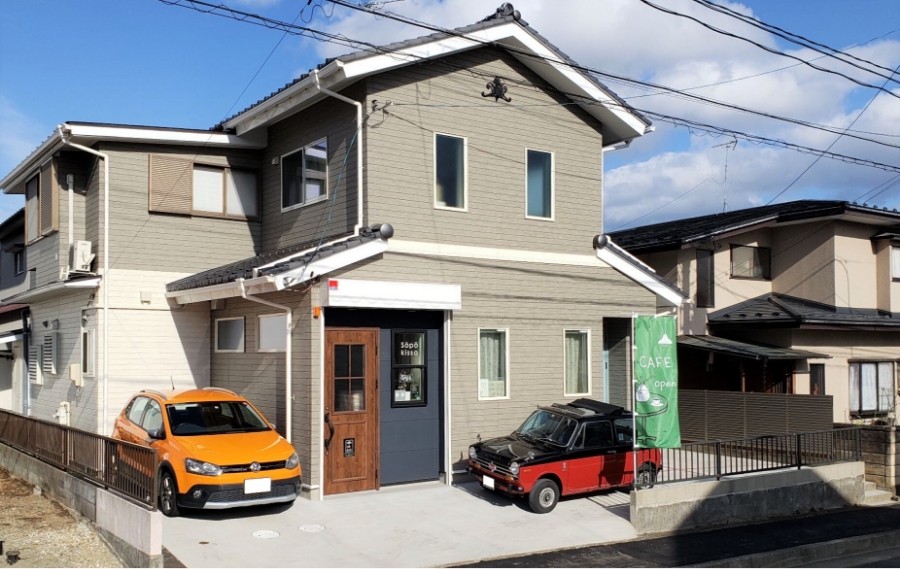 お客様をお迎えしやすいように、道路側の一部を減築して家の前に駐車スペースを確保。カフェらしいエントランスとして再生しています。