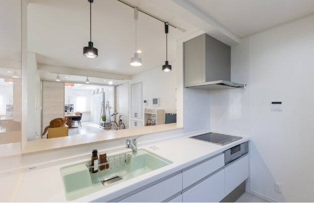 オープンキッチンでLDKの隅々まで視線が届き、開放的な気分で家事ができるように。「造作したキッチンカウンターは配膳や朝食時に活用でき便利です」と奥様。