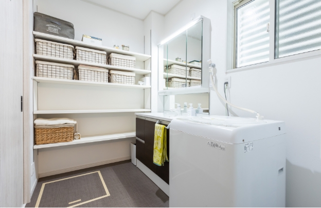 洗面室は取り出しが楽なオープン棚を設置。棚の高さ調整もできる。
