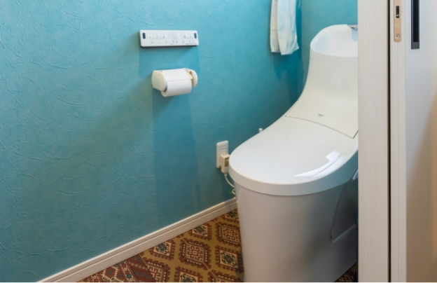 床・壁・天井で壁紙を貼り替え、遊び心あふれるデザインのトイレに。