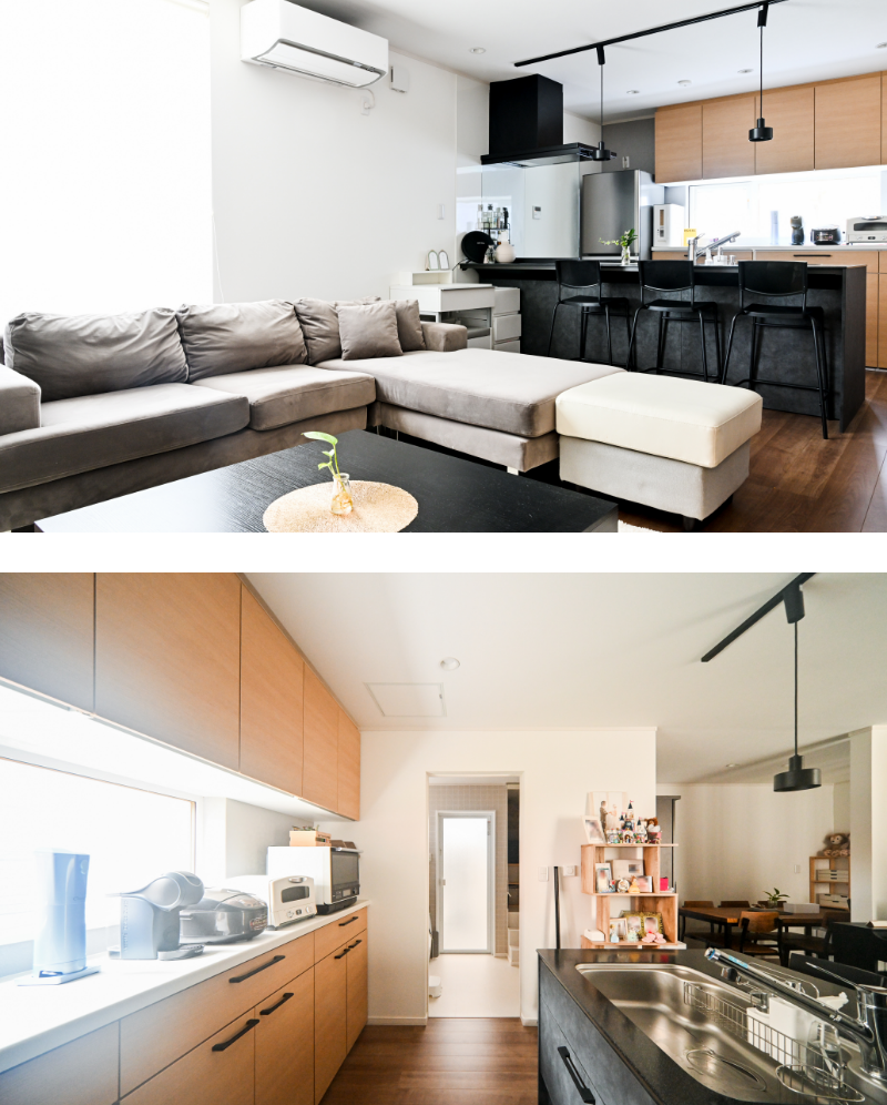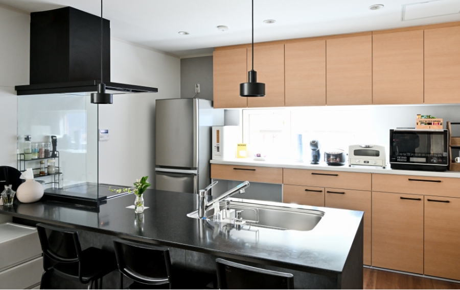 壁付だったキッチンはコミュニケーションも良好なペニンシュラキッチンに。「カウンターが広く、朝食もキッチンで食べられるので後片付けも楽です」。