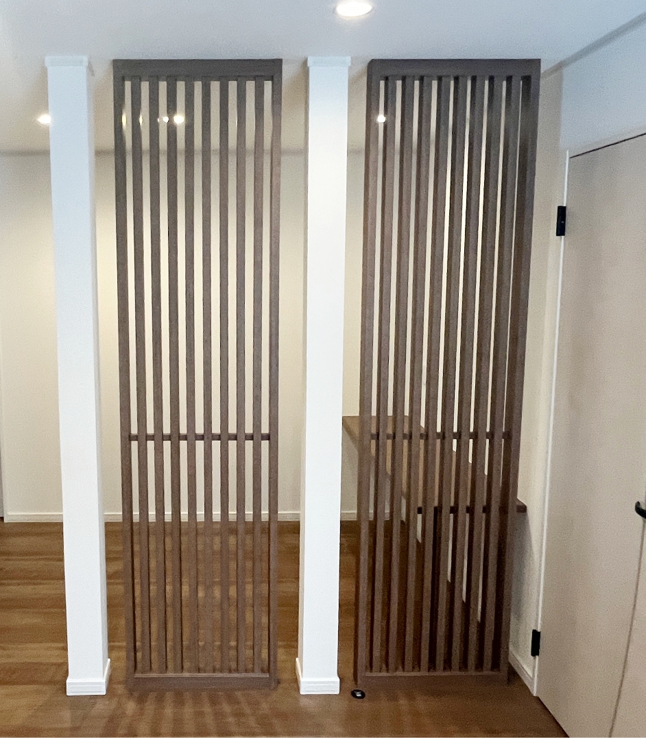 リビングとダイニングの間には取れない柱があり、壁にしてしまうと閉鎖的になるため格子を造作し開放感を損なわないように。