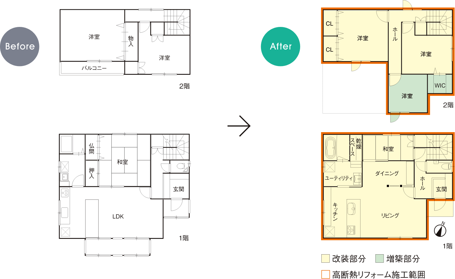 1階部分は、和室を小さくして、LDKとユーティリティスペースを広げ、生活の利便性が向上。和室はコンパクトながら快適なお父様の寝室に。2部屋しかなかった2階は増築の提案で3室に増やし、子ども部屋とご主人様のワークスペースが誕生しました。「気温が10度位なら、暖房をつけなくても室内は暖かいです」と大満足のK様ご家族です。