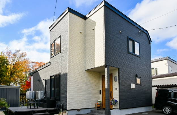2つの外壁材を貼り分けツートンカラーのお洒落な外観デザインに一新。2階部分を増築し、耐震補強も施した。