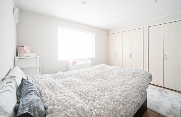 壁面部分を有効活用し、造作収納を設けたご夫婦の寝室。「収納も格段に増えたので、スッキリ暮らせるようになりました」。