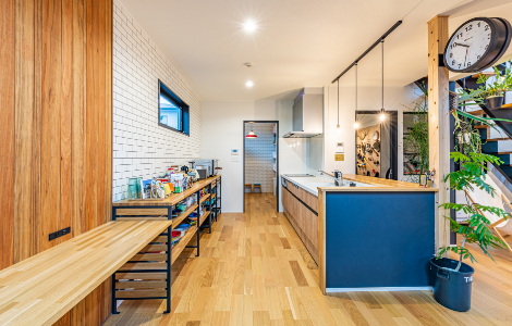 キッチンを中心に後ろにパントリーと水廻りを配置して、効率良く移動ができる動線に。浴室、洗濯機、洗面、トイレが一直線に並び奥様のお気に入りです。