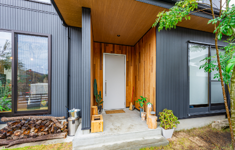 黒の外壁材とサッシ枠に木目柄が映える。断熱工事と気密・断熱性の高いサッシを採用し、薪ストーブの輻射熱で室内はとても暖かく快適。