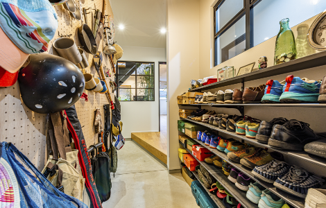 玄関から靴のまま出入りできるシューズインクローク。壁面の有孔パネルにフックを取り付け、自在にアレンジできる収納がとても便利です。