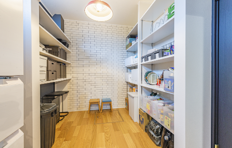 2方向から出入りできる動線にも配慮した大きなパントリー。