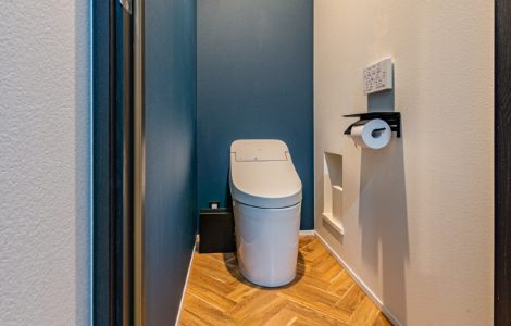 紺色のアクセントクロスとヘリンボーン柄の床材でお洒落な空間に。