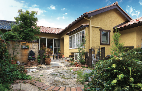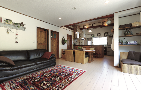 築31年のご自宅を、南欧風の邸宅に改築されたお施主様。奥様の夢は、将来、ご自宅で雑貨ショップを開くこと。アンティーク調の味わいを活かした外観や、玄関から小径のように続く屋内のアプローチ、太い梁を現したナチュラル感あふれるLDKは、奥様がずっと心に温めていた、憧れのイメージそのもの。水廻りの位置も変更し家事もしやすくなりました。