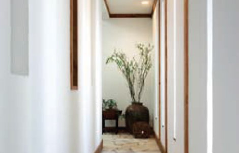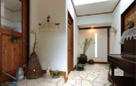 玄関ドアから奥のホールまで続く屋内アプローチを歩くと、天然石の乱張り床や細窓から差し込む光の陰影が美しく贅沢な気分に。