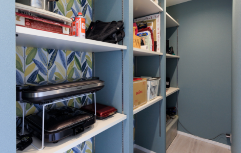 キッチンの後ろにパントリーを造作。食品や日用品のストックが一目でわかるようになりました。
