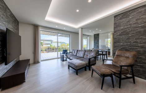 眺めが素晴らしい西側を大空間のLDKに。折り上げ天井と間接照明の効果で、より一層の広がりを感じられます。