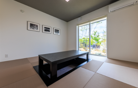 へりなしの半畳たたみでモダンな雰囲気の和室には掘こたつを設置。