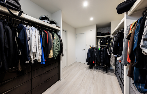 広い空間を活かして2つの部屋には大容量のウォークインクローゼットを造作。キッチンにはカップボードとパントリーを造作して、スッキリとした空間を実現しました。