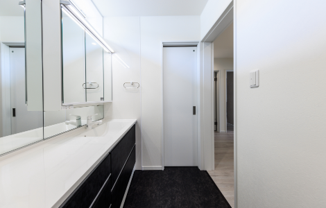 トイレを移動し洗面室を広げ、洗面化粧台は家事カウンターと一体型に。家事カウンターでは洗濯物をたたんだり、アイロンがけをしたりできます。