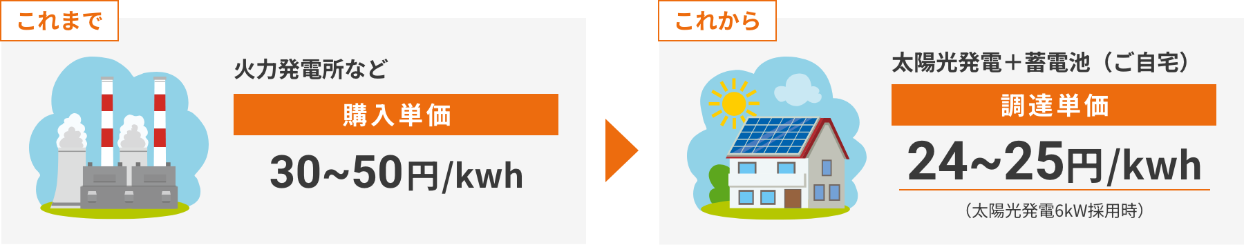 これまで 火力発電所など 購入単価 40~50円/kwh これから 太陽光発電+蓄電池(ご自宅) 調達単価 23~25円/kwh (太陽光発電6kW採用時)