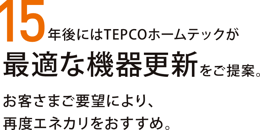 15年後にはTEPCOホームテックが最適な機器更新をご提案。お客さまご要望により、再度エネカリをおすすめ。
