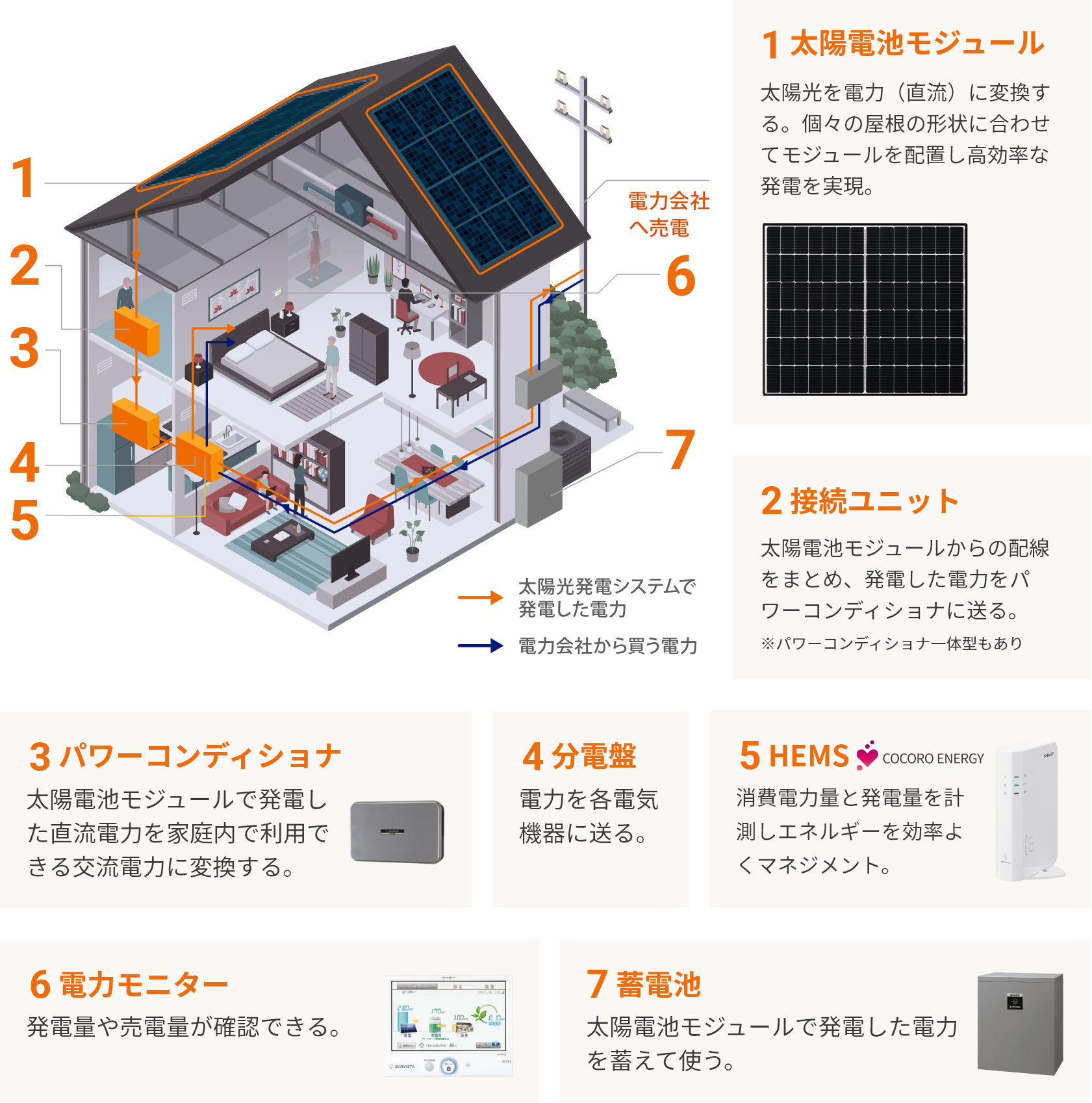 太陽光を電力(直流)に変換する。個々の屋根の形状に合わせてモジュールを配置し高効率な発電を実現。