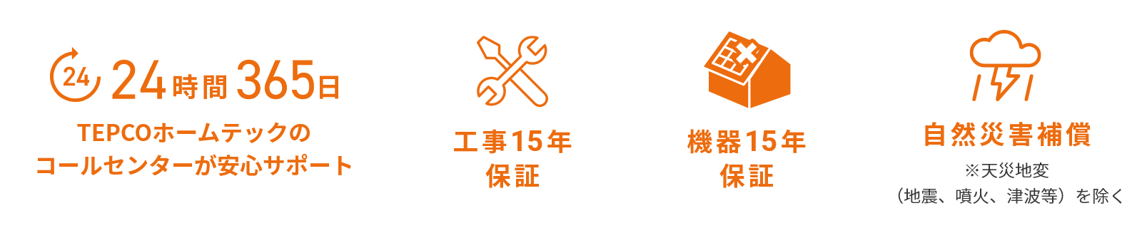 24時間365日 TEPCOホームテックのコールセンターが安心サポート 工事15年保証 機器15年保証 自然災害補償 ※天災地変(地震、噴火、津波等)を除く