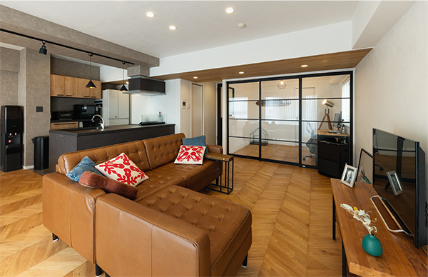 住み慣れた街で中古マンションを購入したN様。 築21年が経ち老朽化も進んでいたことからリフォームで全 てを一新しました。 暗い対面式のキッチンは、南西からの採光を活かして明るいオープンキッチンに。既存の和 室はLDKに取り込み、ガラスの3枚引き戸で仕切ることでワークスペースとしても活用しています。 インテリアのテーマはナチュラル&モダン。 直線的でスタイリッシュなデザインに、白を基調に木目や石目調をバランス良く組み合わせています。