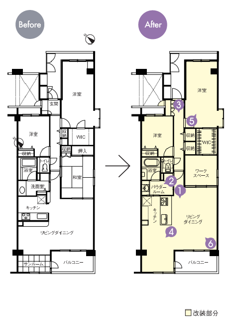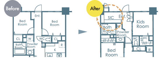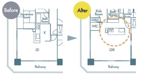 北側のお部屋に、結露が原因でカビが発生していたT様邸。築23年が経ち、設備機器類や部屋全体の老朽化も気になっていました。当初は部分的なリフォームを検討されていましたが、『マンション新築そっくりさん』のイベントに参加し、スケルトンリノベーションで住まいを一新する夢が広がりました。明るい南側のLDと和室をつなげ、開放的なLDKに。キッチン、浴室、洗面化粧台もお気に入りの製品を選んで、快適にお過ごしいただいています。