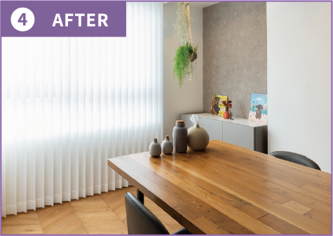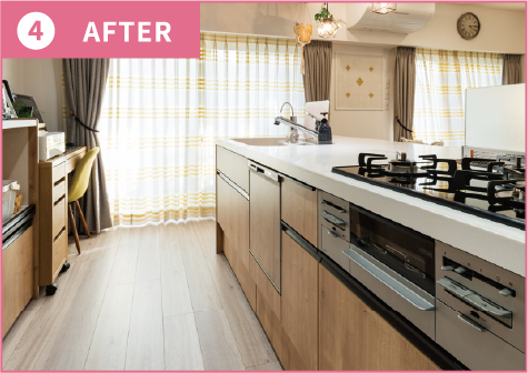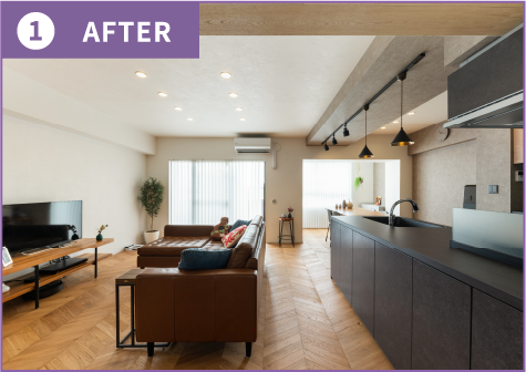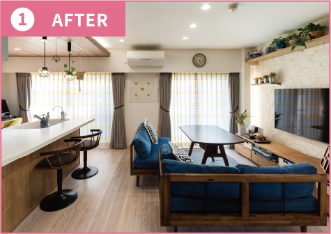 住み慣れた街で中古マンションを購入したN様。築21年が経ち老朽化も進んでいたことからリフォームで全てを一新しました。暗い対面式のキッチンは、南西からの採光を活かして明るいオープンキッチンに。既存の和室はLDKに取り込み、ガラスの3枚引き戸で仕切ることでワークスペースとしても活用しています。インテリアのテーマはナチュラル&モダン。直線的でスタイリッシュなデザインに、白を基調に木目や石目調をバランス良く組み合わせています。