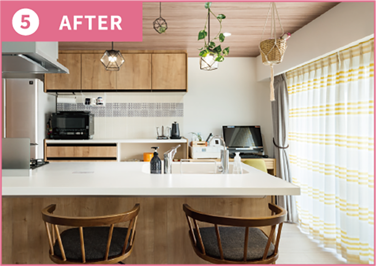 住み慣れた街で中古マンションを購入したN様。築21年が経ち老朽化も進んでいたことからリフォームで全てを一新しました。暗い対面式のキッチンは、南西からの採光を活かして明るいオープンキッチンに。既存の和室はLDKに取り込み、ガラスの3枚引き戸で仕切ることでワークスペースとしても活用しています。インテリアのテーマはナチュラル&モダン。直線的でスタイリッシュなデザインに、白を基調に木目や石目調をバランス良く組み合わせています。