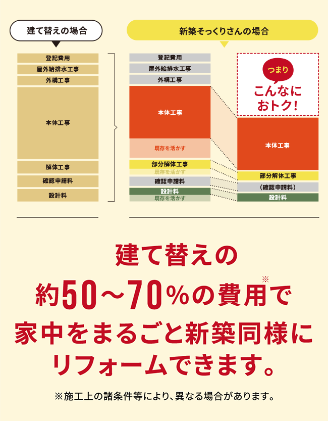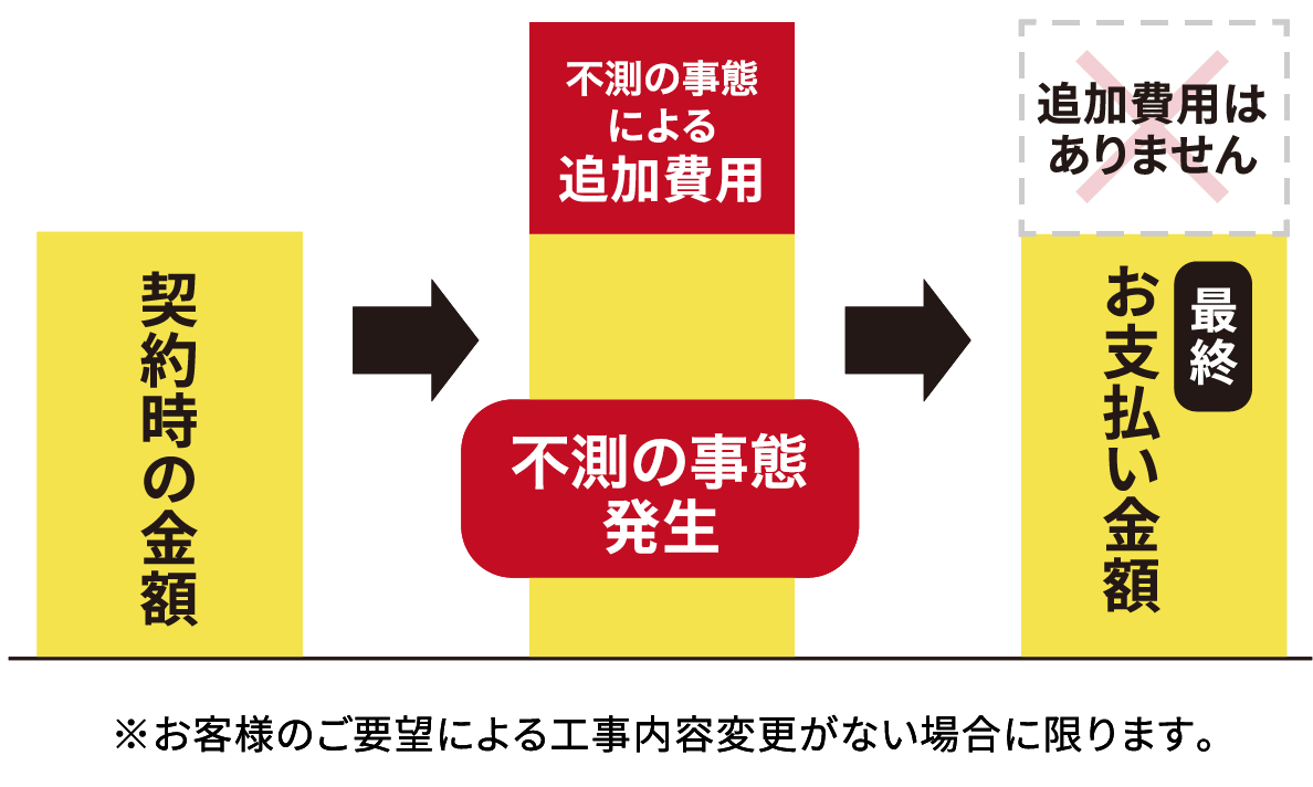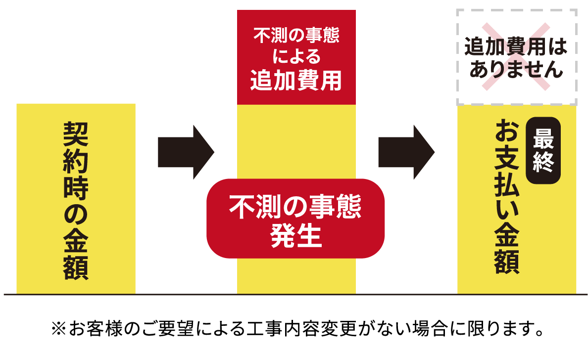 一般的なリフォームでは、想定外の手間や工事が発生するたびに追加費用が発生することがしばしばみられますが、新築そっくりさんでは、着工前に確定した工事費用から追加費用は一切かかりません。