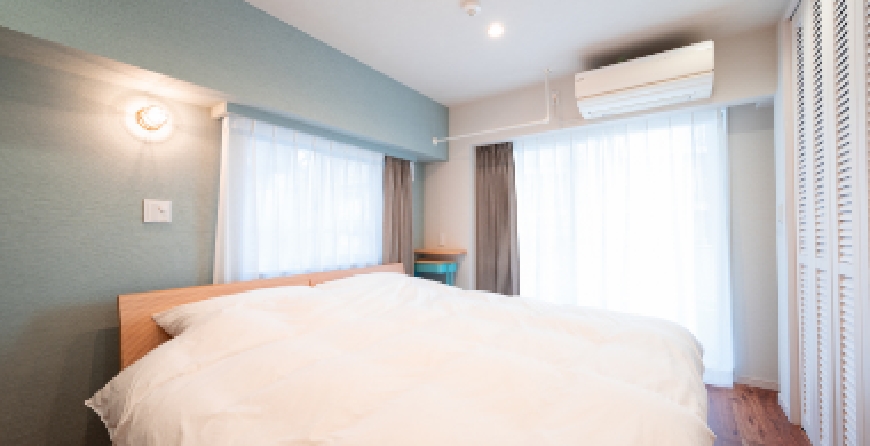 海をイメージしたプルーのアクセントクロスと白のクローゼット扉にはルーバーを用いてカリフォルニアスタイルに。