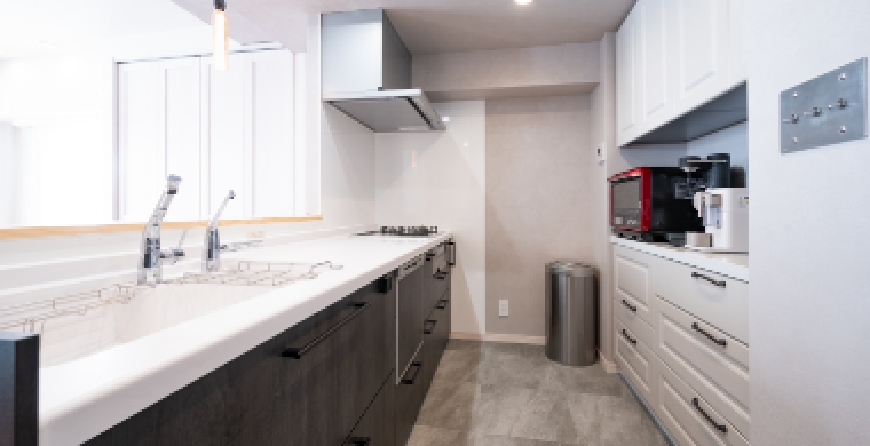 ゆっくりと寛ぐことができる住戸A、お出かけ・お休みの準備と身体を休めるための住戸B、2つの住戸を住み分けるために、スケルトンリノベーションで住まいを一新しました。住戸AのLDKと洋室の壁を取り渡し、大きな掃き出し窓からの採光を活かしたオープンキッチンの明るいLDKに。