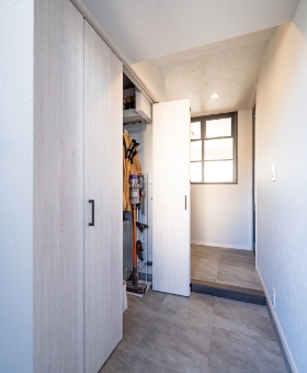奥行を十分に確保した玄関には、スーツケースや掃除機などかさばる物も収納可能な便利な土間のシューズインクローク。「室内に持ち込まず収納できるのは便利です」。