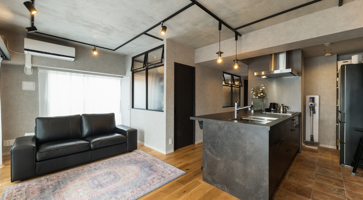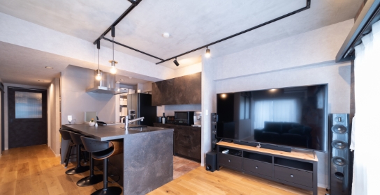 インテリアは、ご夫婦が大好きなブルックリンスタイルに。モルタルやレンガ、ヴィンテージ感のある床材、ブラックカラーの窓枠やレールをもちいてインダストリアルな雰囲気を演出。新築マンションでは手に入れることのできないお好みのインテリアにご満足のご夫婦です。